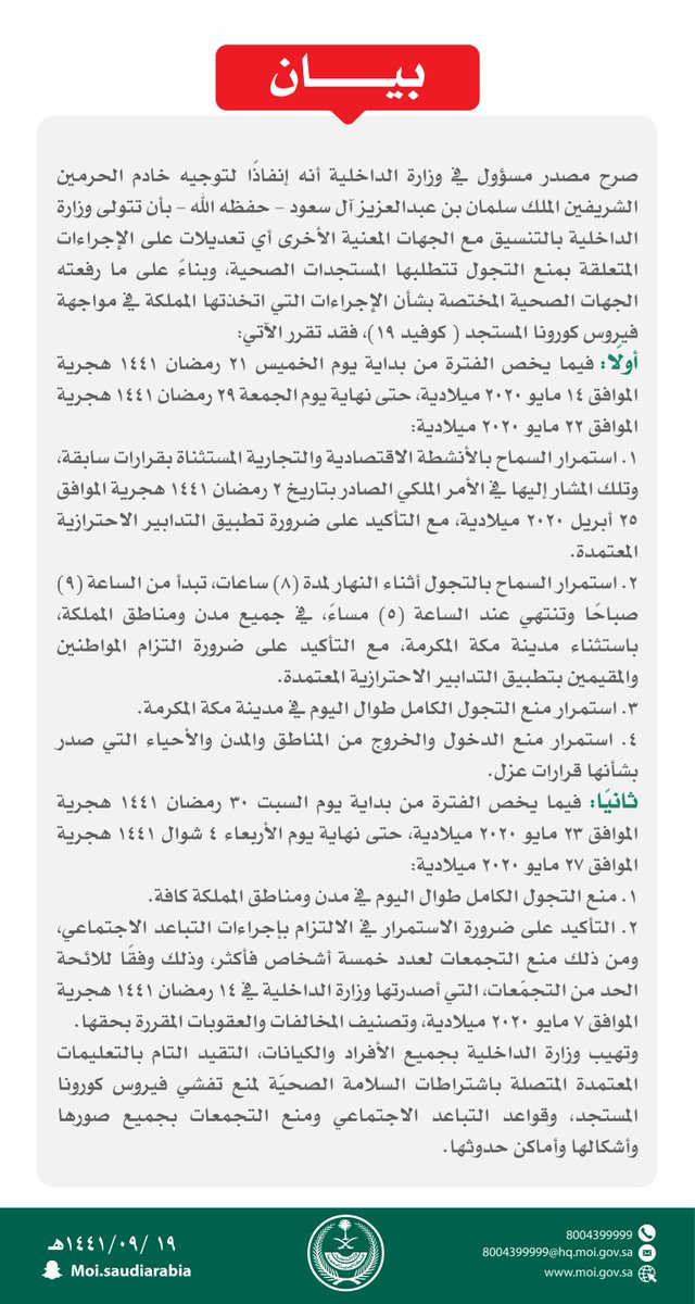 وزارة الداخلية On Twitter مصدر مسؤول بوزارة الداخلية استمرار جميع الإجراءات الاحترازية حتى نهاية شهر رمضان ومنع التجول الكامل خلال الفترة من 30 رمضان وحتى 4 شوال Https T Co Cghlsfsb8w